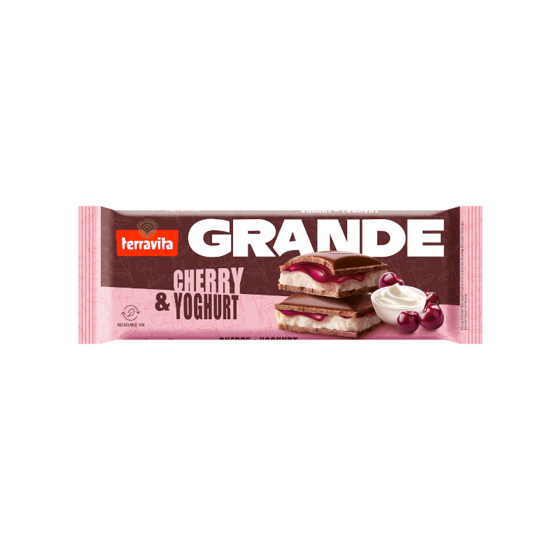 SKŁADNIKI: cukier, tłuszcze roślinne (palmowy, shea), tłuszcz kakaowy, syrop glukozowy, serwatka w proszku (z mleka), mleko w proszku odtłuszczone, miazga kakaowa, przecier wiśniowy 2 %, tłuszcz mleczny, proszek jogurtowy 0,9 % (mleko odtłuszczone, kultury bakterii jogurtowych), emulgatory: lecytyny (w tym sojowe), polirycynooleinian poliglicerolu; koncentrat soku z aronii, substancja utrzymująca wilgoć: sorbitole; koncentrat soku wiśniowego 0,2 %, regulatory kwasowości: kwas cytrynowy, kwas winowy (L(+)-); aromaty, ekstrakt z wanilii, stabilizator: pektyny. Czekolada mleczna: masa kakaowa minimum 27 %. Czekolada mleczna oprócz tłuszczu kakaowego zawiera tłuszcze roślinne. Może zawierać zboża zawierające gluten, orzeszki arachidowe i orzechy.