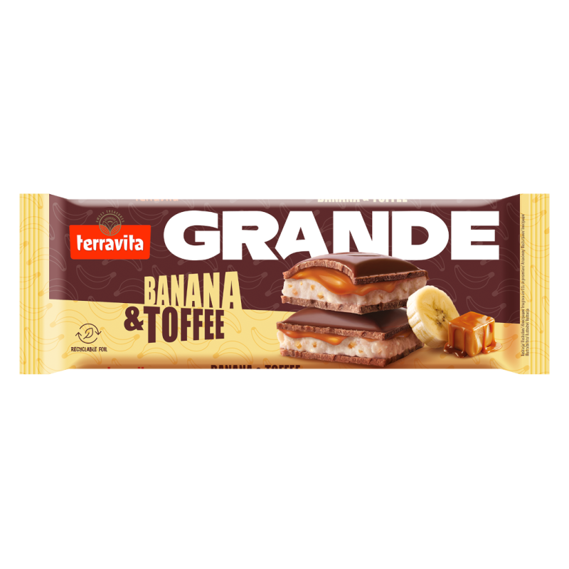 Delikatna mleczna czekolada z dwoma warstwami nadzienia: bananowym i toffi, z dodatkiem chipsów bananowych.