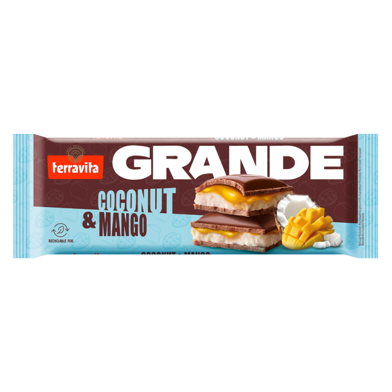 CZEKOLADA MLECZNA Z NADZIENIEM O SMAKU KOKOSOWYM (35 %) I NADZIENIEM MANGO (20 %)